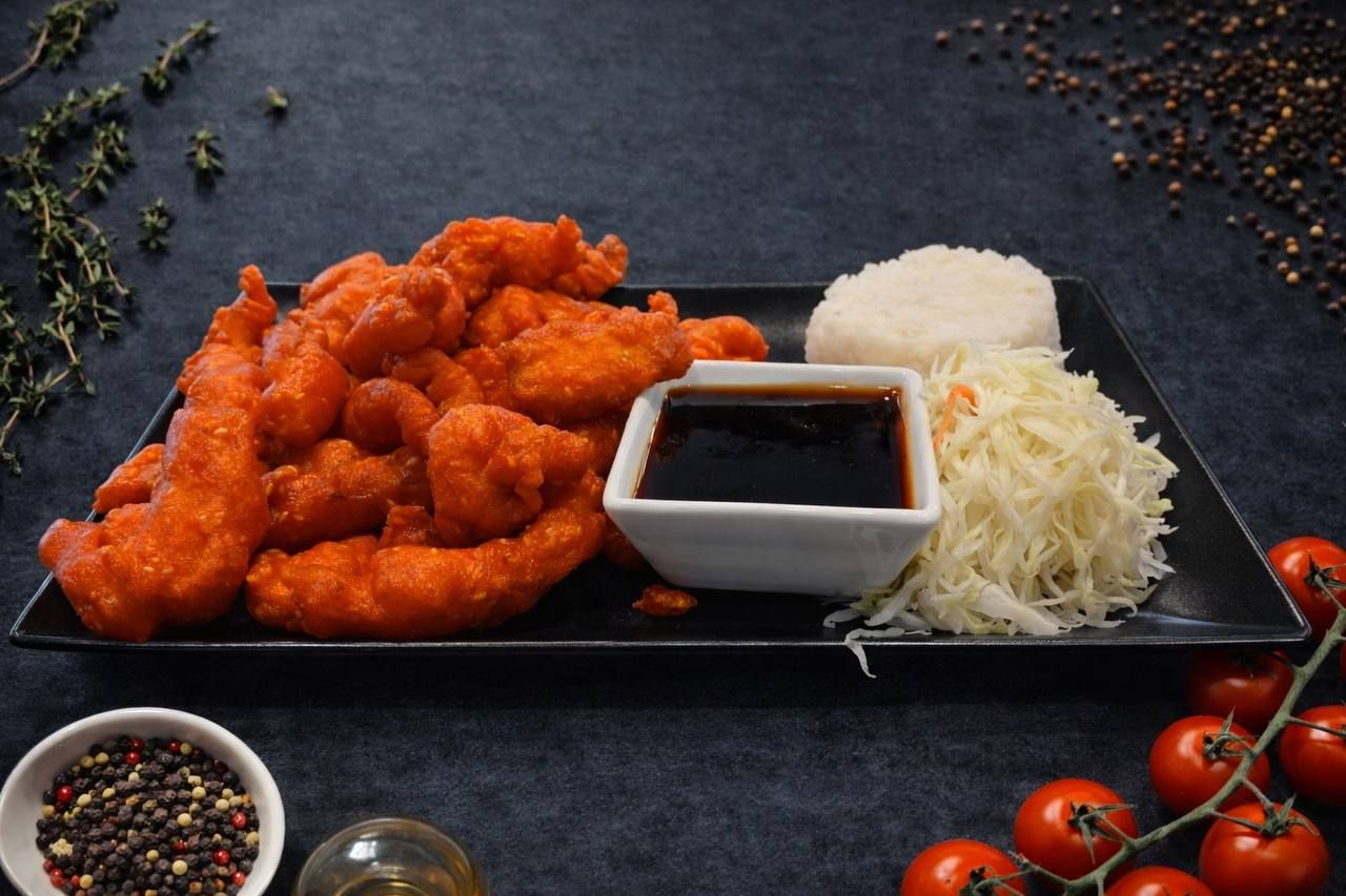 Kulki kurczaka w cieście kokosowym, podawane z sosem słodko-kwaśnym -