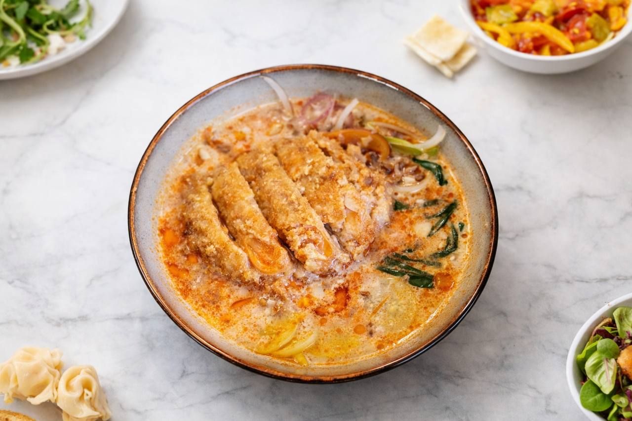 Zupa na bazie mleka kokosowego z kurczakiem i bukietem warzyw -