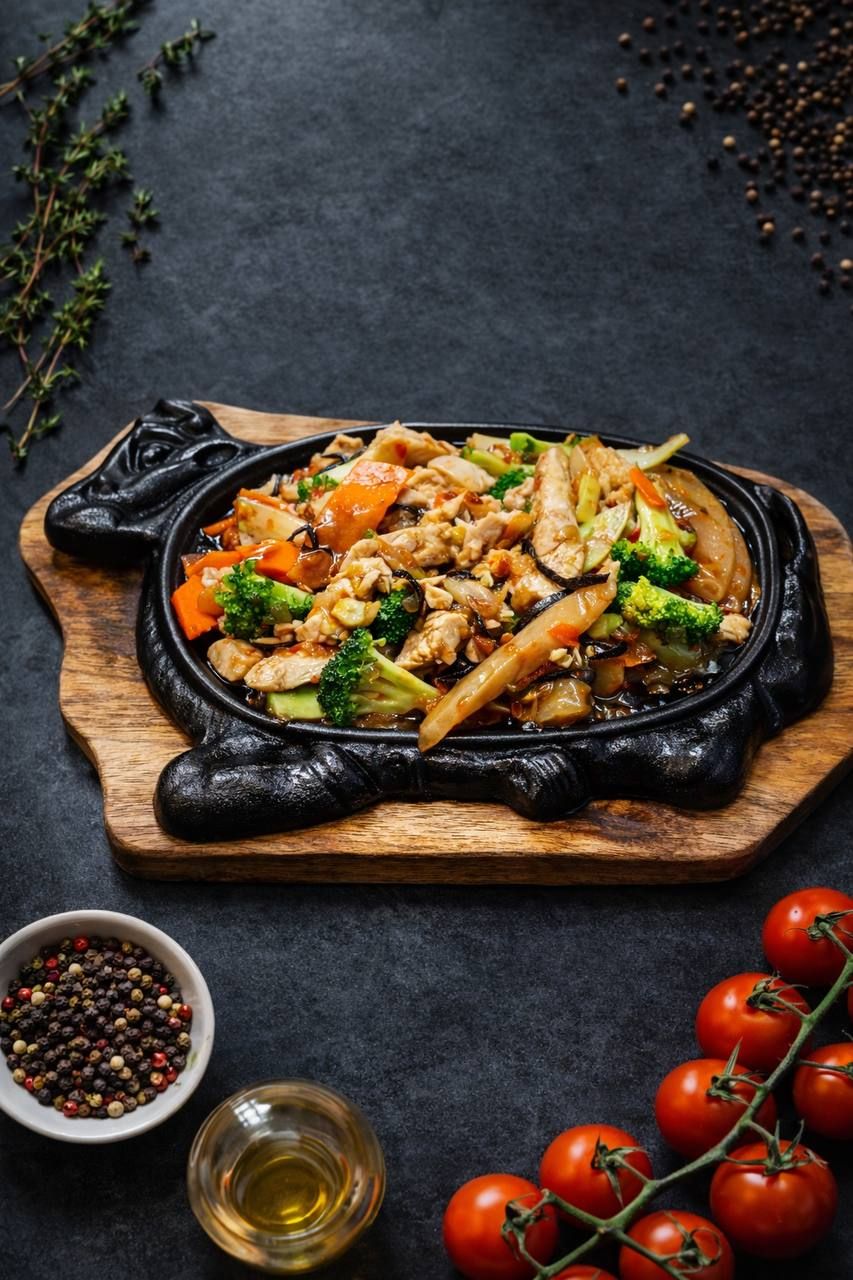 Pierś kurczaka w posypce, sos imbirowo-pomidorowy, warzywa, podawane na gorącym półmisku -