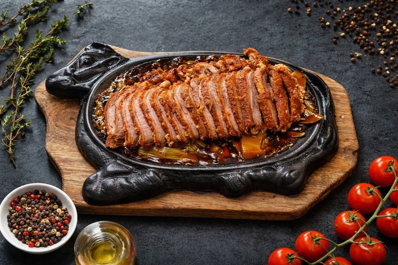 Zapiekana kaczka, bukiet warzyw, sos ostrygowo-miodowy. -