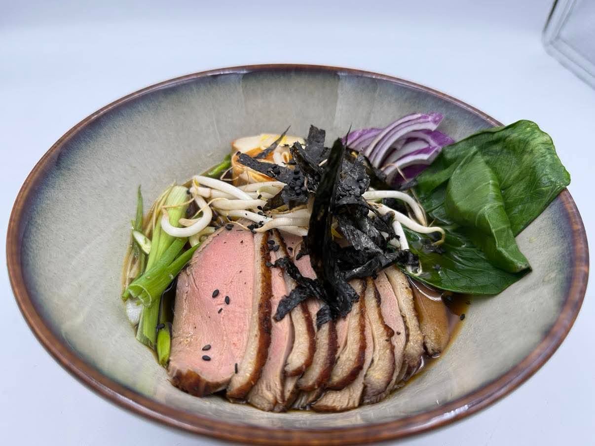 Zapiekana kaczka, bukiet warzyw, sos sojowo-warzywny grzyby mun, bambus i sezam -